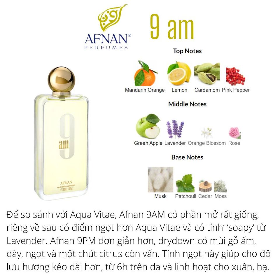 Về Afnan 9AM, Afnan đã xuất sắc làm cho một mùi hương tưởng chừng như đơn giản, rẻ tiền lại trở nên có sức sống và đầy chất lượng đến vậy. Để so sánh với Aqua Vitae, Afnan 9AM có phần mở rất giống, riêng về sau có điểm ngọt hơn Aqua Vitae và có tính’ ‘soapy’ từ Lavender. Afnan 9PM đơn giản hơn, drydown có mùi gỗ ấm, dày, ngọt và một chút citrus còn vấn. Tính ngọt này giúp cho độ lưu hương kéo dài hơn, từ 6h trên da và linh hoạt cho xuân, hạ.