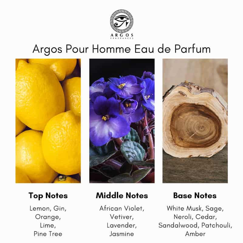 Tươi tắn, lịch thiệp, Argos Pour Homme sẽ phục vụ các quý ông với phong cách mùi hương rất đỗi chuẩn mực. Mùi hương mở đầu bằng Bách xù sáng, gợi tới mùi Gin tươi nhưng không đem lại nhiều cảm giác “boozy”, quyện mềm mại với màu xanh lá dịu dàng của Thông, pha một chút mọng nước của note hương Cam chanh. Khi đã phần nào khô lại trên da, Argos Pour Homme tỏ rõ sự nam tính hơn với Violet hòa cùng Nhài, mượt mà trên nền hương Hoa cam và Xạ hương trắng đầy thanh lịch.