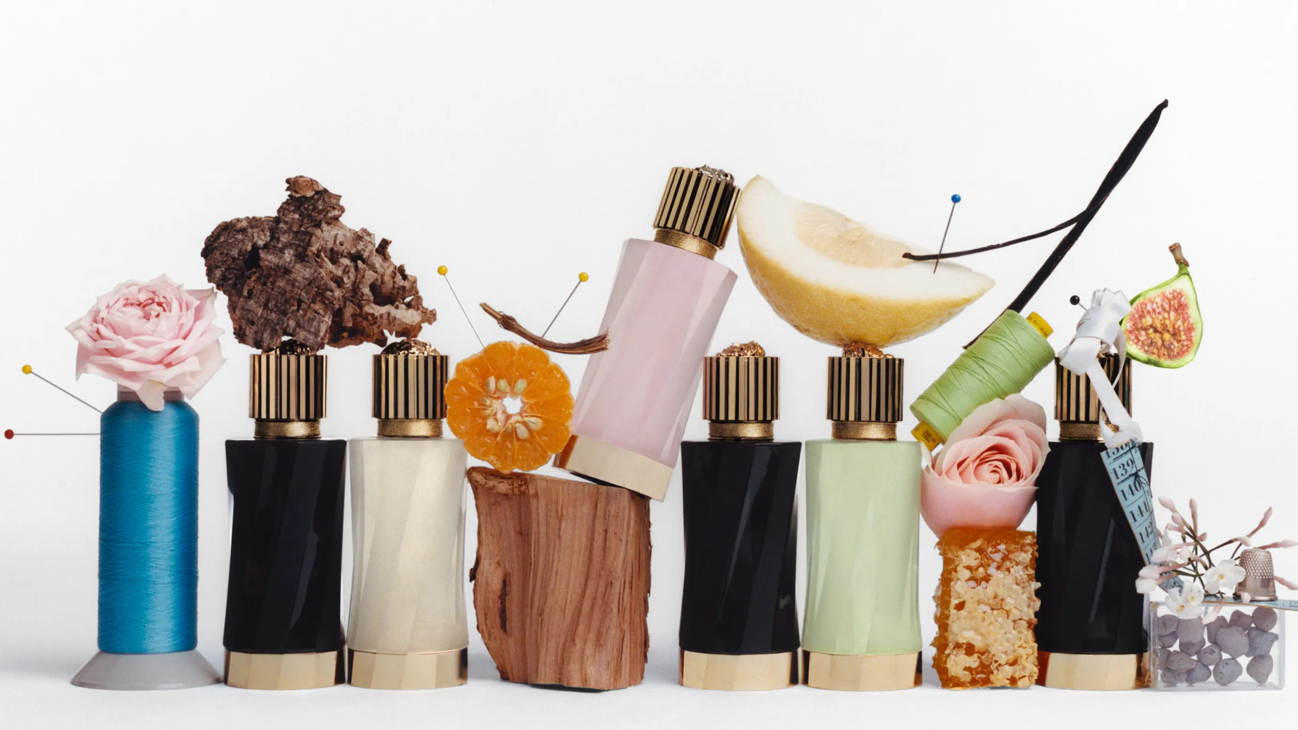 Sự thành thục, khéo léo trong truyền thống may mặc của Atelier đã được gợi tả thông qua việc đóng gói thủ công toàn bộ các chai nước hoa trong bộ sưu tập. Những chai nước hoa mang hương thơm nhẹ dịu, hay tươi mát sẽ được đựng trong những chai thủy tinh trong suốt, trong khi những chai mang mùi hương đậm hơn thì được đựng trong chai màu đen bóng bẩy. Thiết kế vỏ chai sử dụng kỹ thuật xoắn sáng tạo, cùng với điểm nhấn là việc khắc tên mùi hương bằng màu vàng ánh kim bắt mắt. Nắp kim loại được làm thủ công in nổi với họa tiết Medusa đặc trưng. Các lọ nước hoa được đóng gói trong hộp giấy và được tô điểm bởi một đường viền thủ công Hy Lạp màu vàng. Ngoài ra, thiết kế hộp tạo sự ấn tượng với hoạ tiết sơn vàng đặc trưng của logo Atelier Versace.