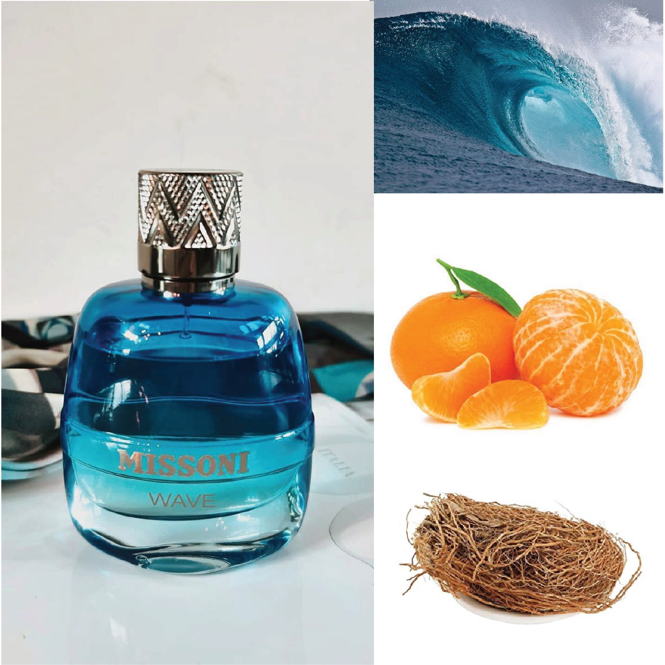 Missoni Wave mở đầu với một quả bom citrus bừng sáng quyện kèm vị mát của hương Biển (một vibe rất rất quen thuộc khi bắt đầu với Chanel Allure Homme Sport). Một chút ngọt nhẹ, dịu hương hoa từ Oải hương, cây Xô Thơm, Rosemary và Pelargonium Ai Cập (Hợp hương hoa này thay thế Neroli, tạo ra âm hưởng Soapy, dày dặn, và Green Aromatic - Đây chính là điểm khác biệt từ Missoni Wave với CAHS). Cuối cùng là dừng lại ở Vanilla Orchid, Rêu sồi, Haiti Vetiver và cây Hoắc Hương.