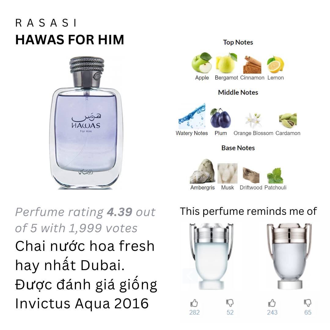 Mùi hương của Hawas rất phong phú. Fruity + nước biển + ambergris tạo nên một tone mùi khá thú vị. Những tầng hương của Hawas phức tạp nhiều hơn so với mong đợi. Khi dry down mùi tương tự như Versace Pour homme, không giống hẳn nhưng same vibe. Có cam quýt + hương biển + bubble gum. Thích hợp blind buy.